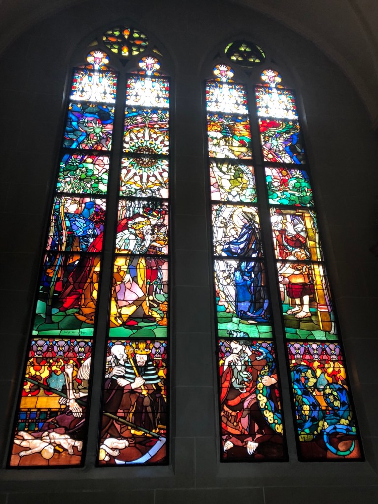 All of the stained glass windows in the church tell a story about someone. The panels on the left of this window seemed a little creepy.