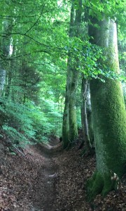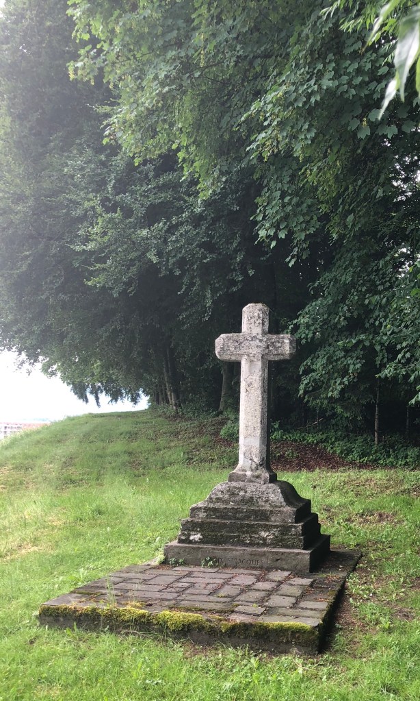 Leaving the city, and having a little time in hand thanks to our wagon ride, we split a pizza for lunch. Continuing on, and finally out of the suburbs, we come to the Stone crucifix Belle croix, on the edge of the woods near Moncor. Dedicated to St. James, this has been an important pilgrimage stop since at least 1480.