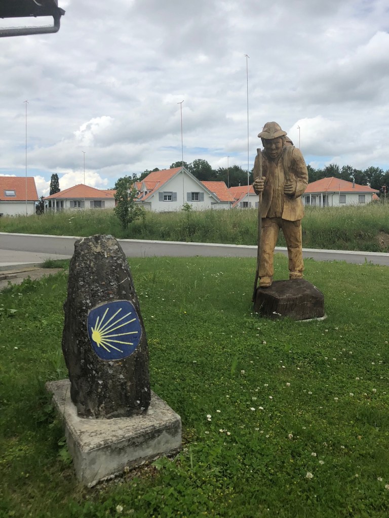 As we approach Posieux, we see an interesting wood carving celebrating the Camino.