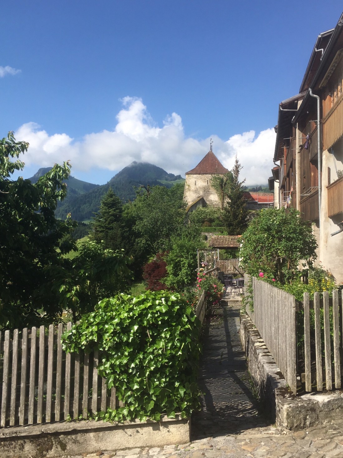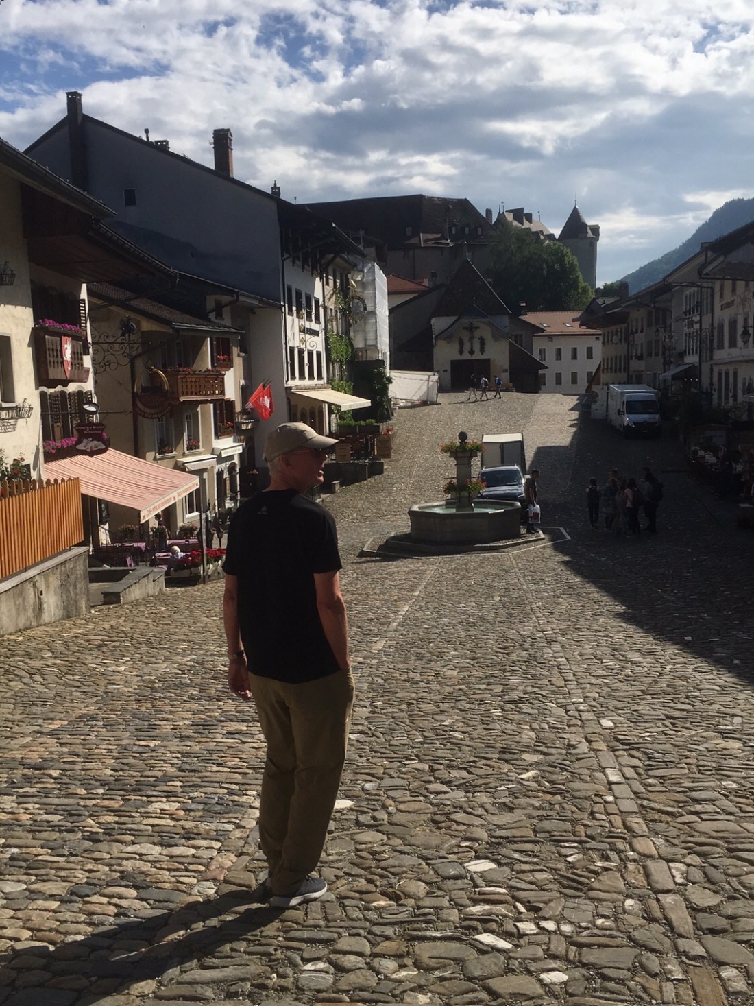 As we eat lunch and wait out the rain we see something which strikes us as odd, or at least new. Here in Gruyeres at least, fondue is served with thick slices of bread, to be torn by hand at the table, and a bowl of boiled potatoes. It’s as if they want to make sure you are not disappointed if what you really meant to order was raclette!
