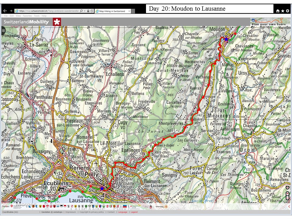 And very importantly, we used the internet extensively in the months ahead of the trip to study the route, learn some of the relevant history and alert ourselves to noteworthy sites. In fact, two apps proved to be indispensable. The SBB (Swiss national railway) app (one of the greatest things ever!) lets you check train and bus schedules and buy tickets, right up to the time you board the train/bus. It was incredibly easy to use and very convenient – much easier than using the ticket machines. Then the Switzerland Mobility app (essentially a GPS map of the Jakobsweg) was great at keeping us on the trail (or leading us back when we missed a signpost and wandered off!). If any of you are thinking of walking in Switzerland, we strongly recommend that you take full advantage of these two apps.